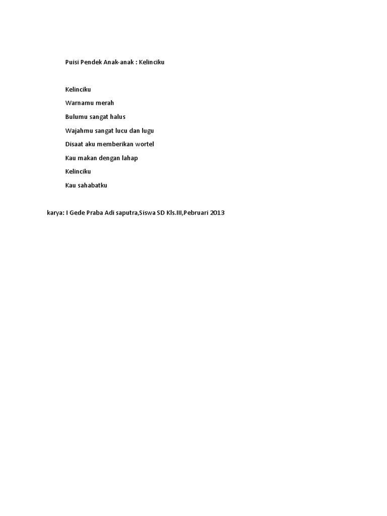 Puisi ini sangat membantu dalam pengekpresian diri anak tersebut, biasanya mereka akan maju dengan percaya indonesia negaraku. Kelinciku kau amat sangat lucu bulumu sangat indah telinga mu sangat panjang. Puisi merupakan teks yang berbentuk monolog. Berisi puisi cinta singkat, islami, puisi romantis pendek, sedih, dan lucu. Download lagu puisi kelinci (4.51mb) dan streaming kumpulan lagu puisi kelinci (4.51mb) hasil diatas adalah hasil pencarian dari anda puisi kelinci mp3 dan menurut kami yang paling cocok.